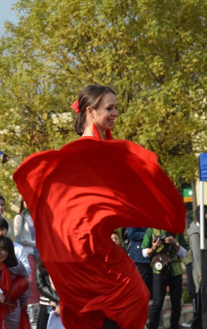 一提起舞蹈,金娜神采飞扬,自豪兴奋之情溢于言表,“我从一岁半就开始学跳舞,当站在舞台中央,音乐响起,我就会手舞足蹈,那种感觉就像鱼儿回到了水中,就像婴儿回到了母亲的怀抱,所以对我来说舞蹈意味着生命、自由和享受”在不久前结束的第六届国际文化艺术节上,让观众大饱眼福的俄罗斯自由之舞和由多国职工集体表演的迈克杰克逊舞蹈就是由金娜组织编排的。金娜稳定的发挥、快速的应变、极富表现力和感染力的舞蹈表演留给在场观众深刻印象。“离演出只有一周时才确定了这2个节目,参加表演的员工舞蹈水平参差不齐,大家白天都有课,我们只能从晚上抽出两个多小时进行排练,时间真的很紧,我已经是一个3岁孩子的妈妈,我还要照顾孩子,我压力也很大。但是如果你真的喜欢做这件事情,无论如何你也会把它做好,这是发自内心的热爱。”