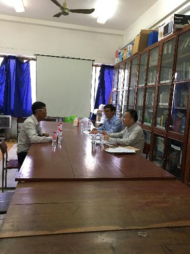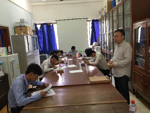 在柬埔寨理工公司,公司代表团参观了该校水利和水资源公司,同该院经理Sarann Ly教授及相关教研室主任进行了座谈交流,并对该院推荐申请中国政府奖学金项目的7名同学进行面试和专业能力考试。